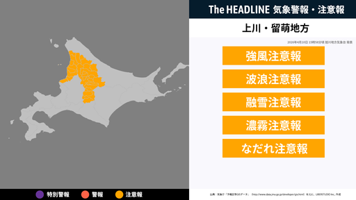 4月10日15時58分頃、上川地方・留萌地方に強風注意報・波浪注意報などが発表