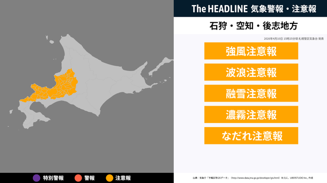4月10日15時25分、札幌管区気象台より石狩地方・空知地方・後志地方に強風注意報・波浪注意報などが発表された。