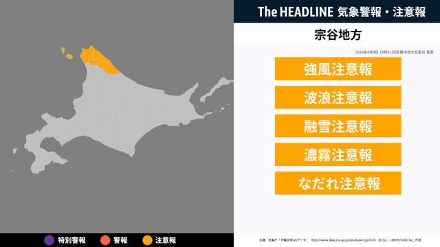 宗谷地方では、4日夜のはじめ頃まで強風に、4日夜遅くまで高波に、5日昼前まで融雪による土砂災害に、4日夜遅くから5日昼前まで濃霧による視程障害に、5日までなだれに注意。