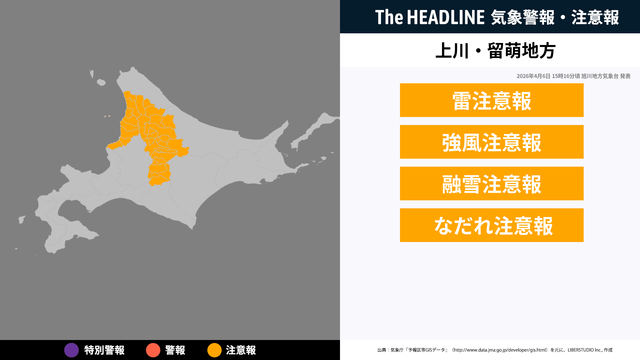 4月6日15時16分、旭川地方気象台より上川地方・留萌地方に雷注意報・強風注意報などが発表された。
