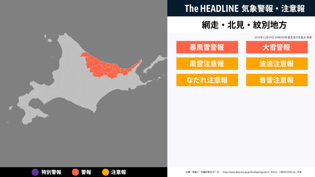 12月14日18時9分、網走地方気象台より網走・北見・紋別地方に暴風雪警報・大雪警報などが発表された。対象の市区町村にお住まいの方は、最新の情報を入手しつつ、避難や警戒など適切な行動を取る必要がある。