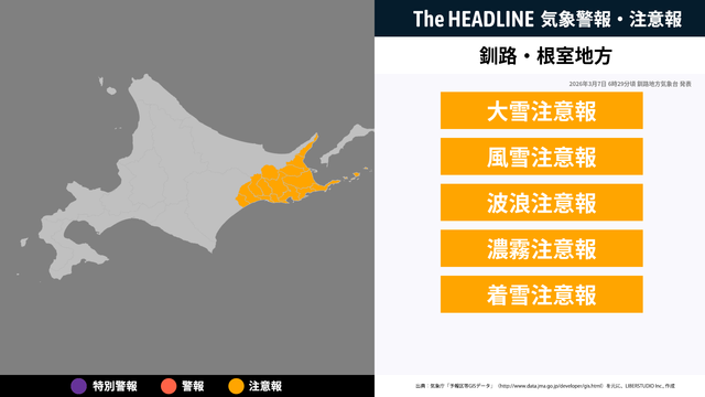 3月7日6時29分頃、根室地方・釧路地方に大雪注意報・風雪注意報などが発表