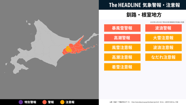 12月15日7時28分、釧路地方気象台より根室地方・釧路地方に暴風雪警報・波浪警報などが発表された。対象の市区町村にお住まいの方は、最新の情報を入手しつつ、避難や警戒など適切な行動を取る必要がある。