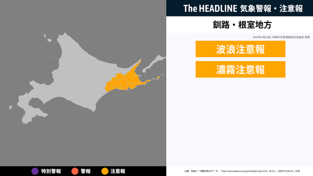 3月18日15時50分、釧路地方気象台より根室地方・釧路地方に波浪注意報・濃霧注意報が発表された。