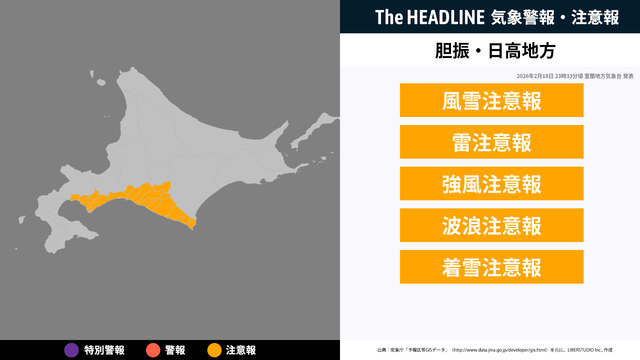 現在、日高地方に発表されている警報・注意報。お住まいの方は、情報に注意する必要があり、情報の更新を確認することが望ましい。
