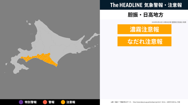 3月22日15時48分頃、胆振地方・日高地方に濃霧注意報・なだれ注意報が発表