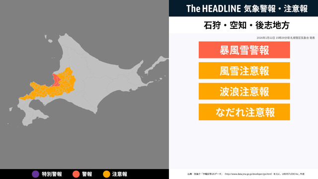 1月12日15時29分、札幌管区気象台より石狩地方・空知地方・後志地方に暴風雪警報・風雪注意報などが発表された。対象の市区町村にお住まいの方は、最新の情報を入手しつつ、避難や警戒など適切な行動を取る必要がある。