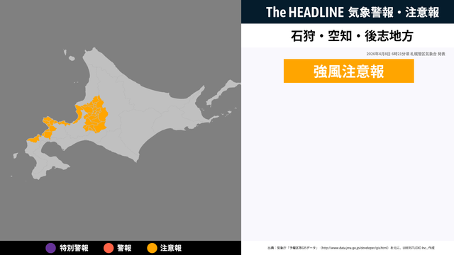 4月8日6時21分頃、石狩地方・空知地方・後志地方に強風注意報が発表