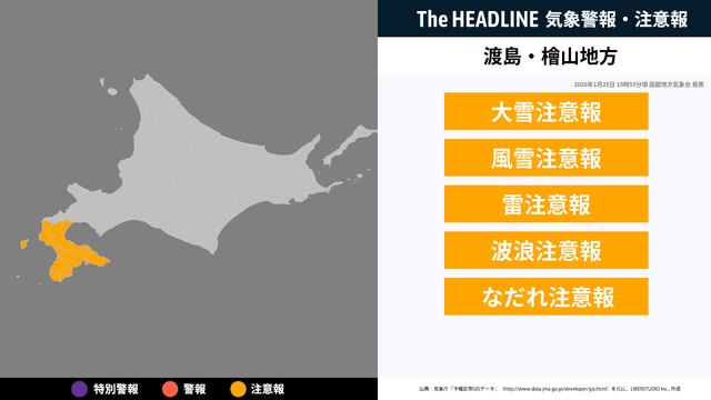 1月25日15時55分頃、渡島地方・檜山地方に大雪注意報・風雪注意報などが発表