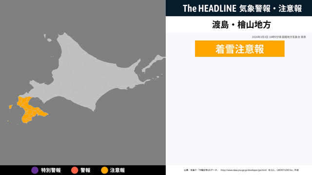 3月3日16時9分、函館地方気象台より渡島地方・檜山地方に着雪注意報が発表された。