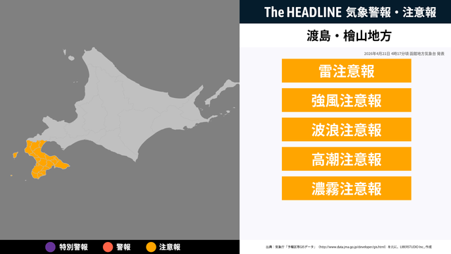 現在、渡島地方に発表されている警報・注意報。お住まいの方は、情報に注意する必要があり、情報の更新を確認することが望ましい。