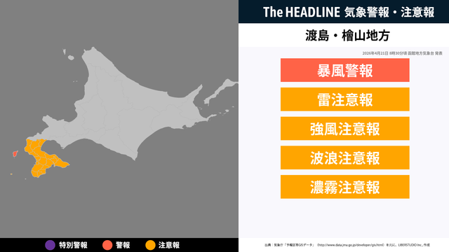 4月21日8時30分、函館地方気象台より渡島地方・檜山地方に暴風警報・雷注意報などが発表された。対象の市区町村にお住まいの方は、最新の情報を入手しつつ、避難や警戒など適切な行動を取る必要がある。