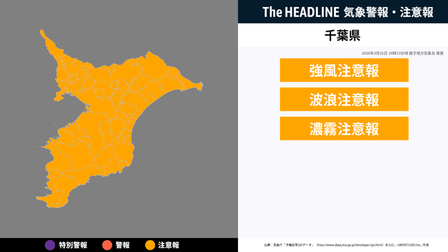3月31日16時13分、銚子地方気象台より千葉県に強風注意報・波浪注意報などが発表された。