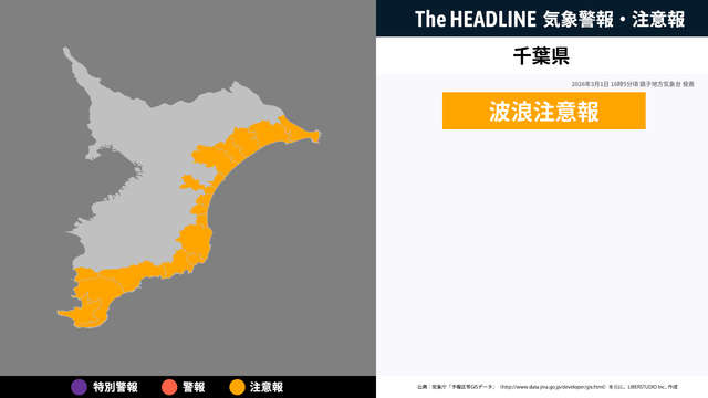 3月1日16時5分頃、千葉県の波浪注意報が更新