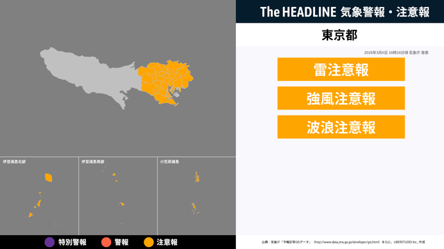 3月6日16時16分、気象庁より東京都に雷注意報・強風注意報などが発表された。