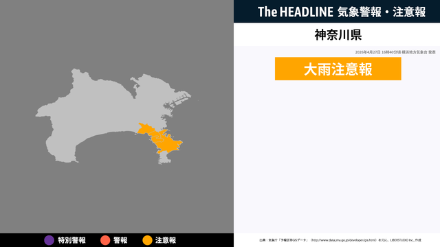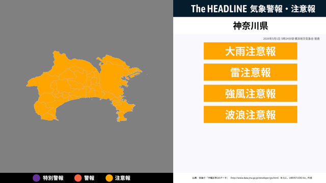 現在、神奈川県に発表されている警報・注意報。お住まいの方は、情報に注意する必要があり、情報の更新を確認することが望ましい。