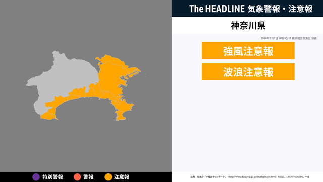 3月7日6時16分頃、神奈川県に強風注意報・波浪注意報が発表