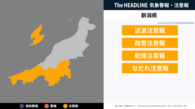 12月20日15時50分頃、新潟県に波浪注意報・融雪注意報などが発表