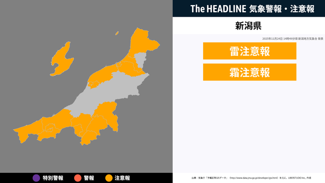 11月24日14時49分頃、新潟県に雷注意報・霜注意報が発表