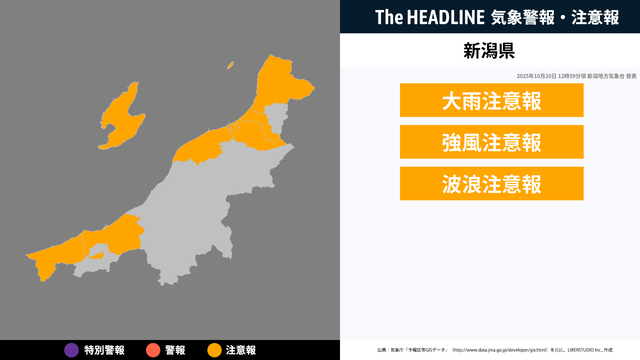 現在、新潟県に発表されている警報・注意報。お住まいの方は、情報に注意する必要があり、情報の更新を確認することが望ましい。