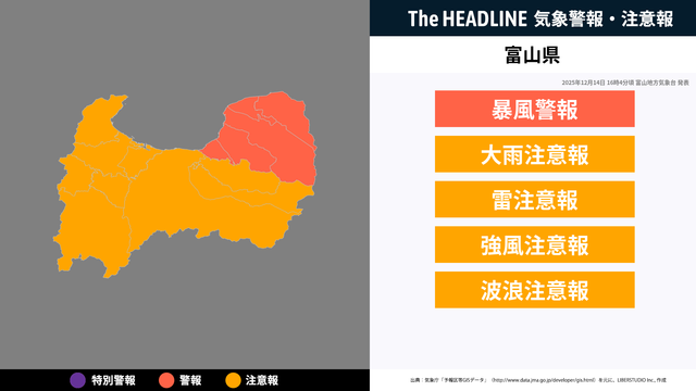 12月14日16時4分頃、富山県に暴風警報・大雨注意報などが発表