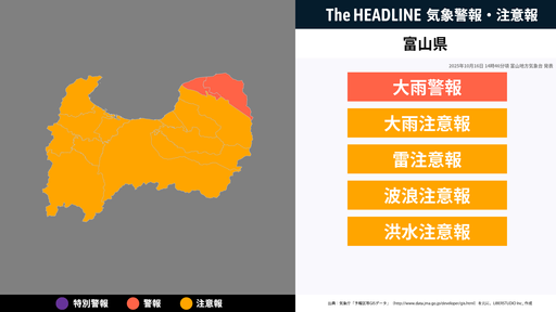 10月16日14時46分頃、富山県に大雨警報・大雨注意報などが発表