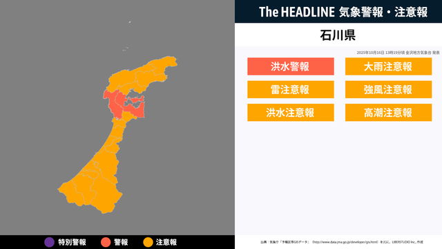10月16日13時19分、金沢地方気象台より石川県に洪水警報・大雨注意報などが発表された。対象の市区町村にお住まいの方は、最新の情報を入手しつつ、避難や警戒など適切な行動を取る必要がある。