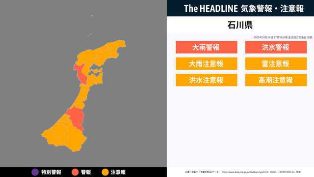 10月16日17時58分、金沢地方気象台より石川県に大雨警報・洪水警報などが発表された。対象の市区町村にお住まいの方は、最新の情報を入手しつつ、避難や警戒など適切な行動を取る必要がある。