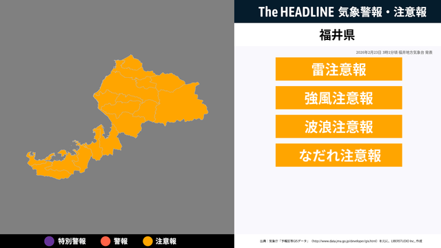 2月23日3時1分頃、福井県の雷注意報・強風注意報などが更新
