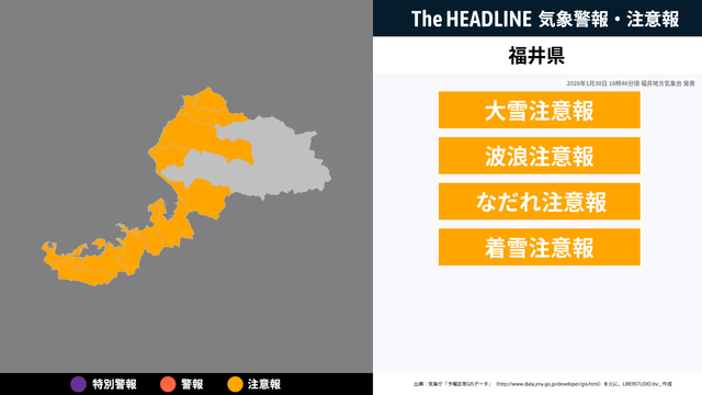 1月30日16時46分頃、福井県の大雪注意報・波浪注意報などが更新