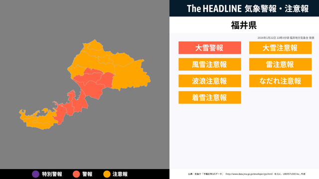 1月22日22時3分、福井地方気象台より福井県に大雪警報・大雪注意報などが発表された。対象の市区町村にお住まいの方は、最新の情報を入手しつつ、避難や警戒など適切な行動を取る必要がある。