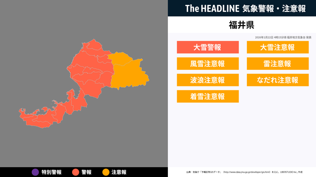 1月22日4時15分、福井地方気象台より福井県に大雪警報・大雪注意報などが発表された。対象の市区町村にお住まいの方は、最新の情報を入手しつつ、避難や警戒など適切な行動を取る必要がある。