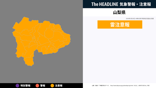 3月29日16時6分頃、山梨県の雷注意報が更新