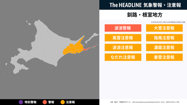 2月28日10時11分、釧路地方気象台より根室地方・釧路地方に波浪警報・大雪注意報などが発表された。対象の市区町村にお住まいの方は、最新の情報を入手しつつ、避難や警戒など適切な行動を取る必要がある。