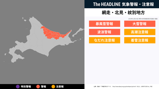 12月15日0時14分頃、網走・北見・紋別地方の暴風雪警報・大雪警報などが更新