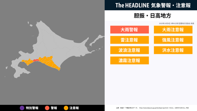 10月8日3時41分、室蘭地方気象台より胆振地方・日高地方に大雨警報・大雨注意報などが発表された。対象の市区町村にお住まいの方は、最新の情報を入手しつつ、避難や警戒など適切な行動を取る必要がある。