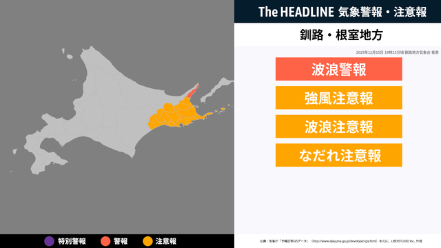 12月15日19時23分、釧路地方気象台より根室地方・釧路地方に波浪警報・強風注意報などが発表された。対象の市区町村にお住まいの方は、最新の情報を入手しつつ、避難や警戒など適切な行動を取る必要がある。