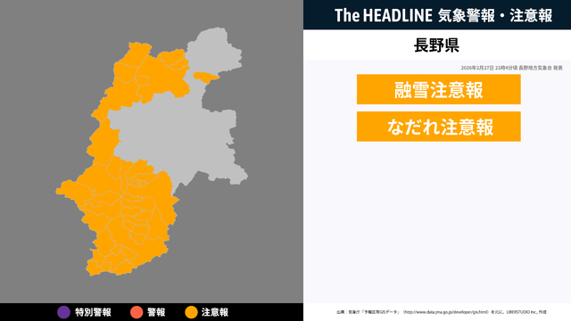2月27日8時6分頃、長野県に融雪注意報・なだれ注意報が発表
