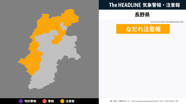 現在、長野県に発表されている警報・注意報。お住まいの方は、情報に注意する必要があり、情報の更新を確認することが望ましい。