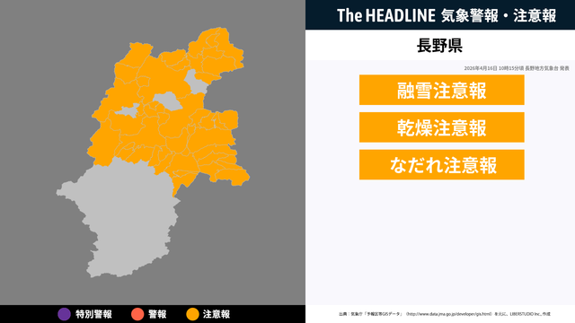 4月16日10時15分頃、長野県に融雪注意報・乾燥注意報などが発表