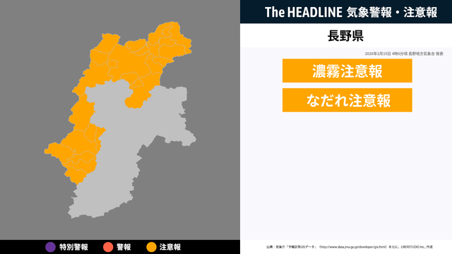 2月14日4時11分頃、長野県に濃霧注意報・なだれ注意報が発表