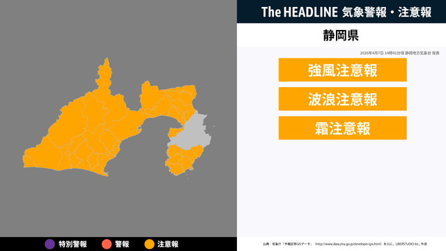 過去から現在にかけて、静岡県に発表された気象警報・注意報の一覧。