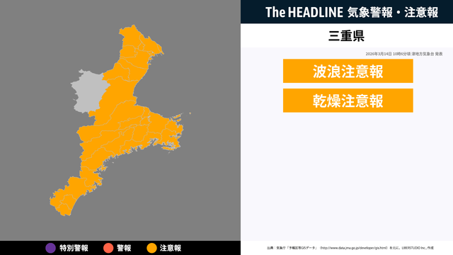 3月14日10時6分頃、三重県に波浪注意報・乾燥注意報が発表