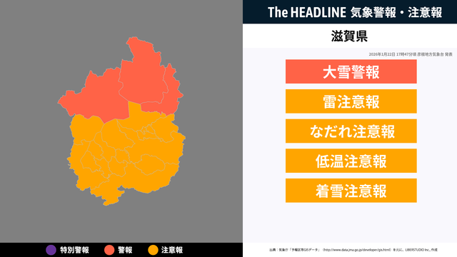 1月22日17時47分、彦根地方気象台より滋賀県に大雪警報・雷注意報などが発表された。対象の市区町村にお住まいの方は、最新の情報を入手しつつ、避難や警戒など適切な行動を取る必要がある。
