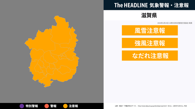 現在、滋賀県に発表されている警報・注意報。お住まいの方は、情報に注意する必要があり、情報の更新を確認することが望ましい。