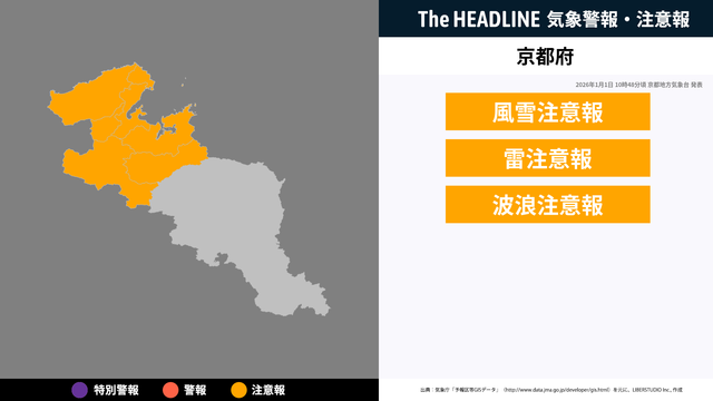 1月1日10時48分頃、京都府に風雪注意報・雷注意報などが発表