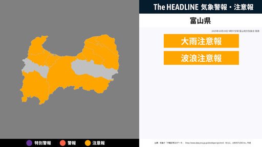 10月19日5時57分頃、富山県に大雨注意報・波浪注意報が発表