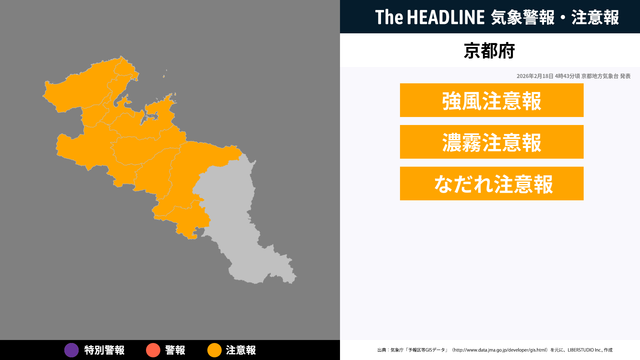 2月18日4時43分頃、京都府に強風注意報・濃霧注意報などが発表