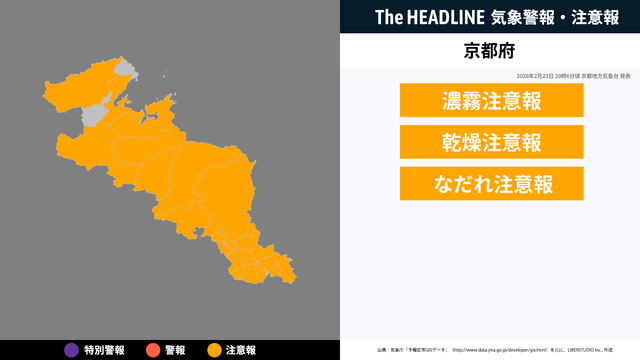 2月23日20時6分、京都地方気象台より京都府に濃霧注意報・乾燥注意報などが発表された。