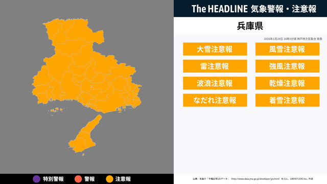 1月29日16時3分頃、兵庫県の大雪注意報・風雪注意報などが更新
